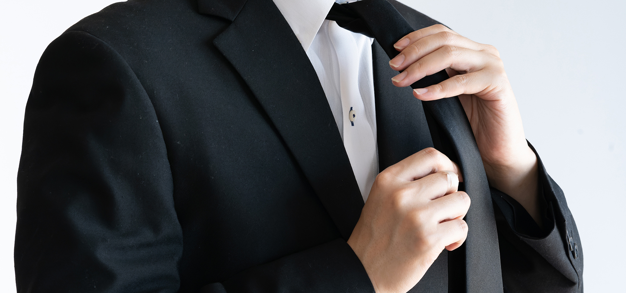 | スーツ | 黒無地のブラックスーツ(シングルまたはダブル)。正式には「準喪服」として、上下黒のスーツを着用します。 ※仕事帰りなどで急いで通夜に駆けつける場合は、黒の喪服ではなく、紺やグレーのスーツも可。ただしネクタイは黒に変更するか、無い場合は外すのが無難です。 ※コート・上着は、黒、濃紺、グレーなどの地味な色のものを着用し、会場に入る前に脱ぎましょう。革製品や毛皮(殺生を連想させるため)は避けましょう。 |